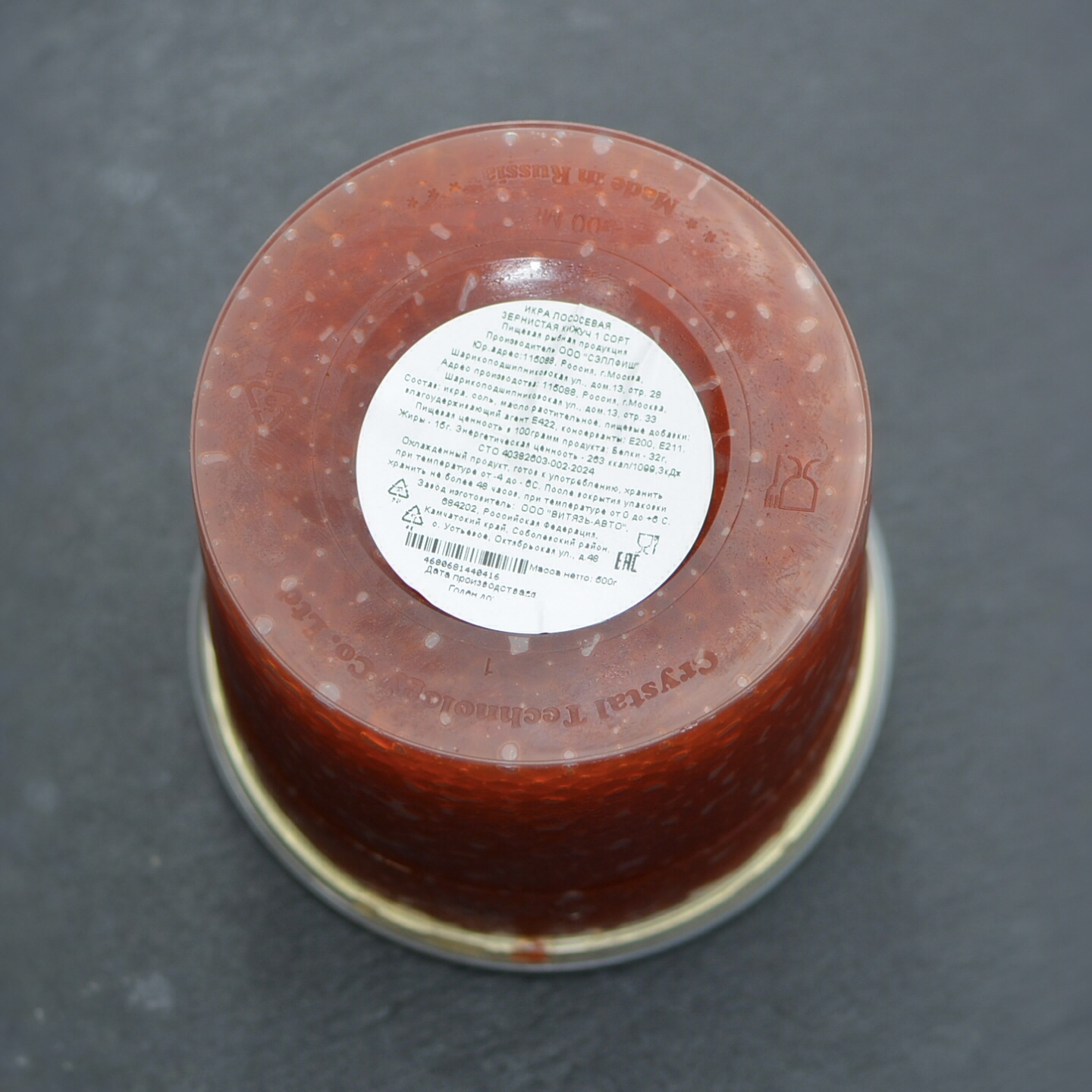 Заводская упаковка 500 г. Изготовлено в Камчатском крае заводом ООО "Витязь-Авто" производителем ООО "СЭЛЛФИШ".