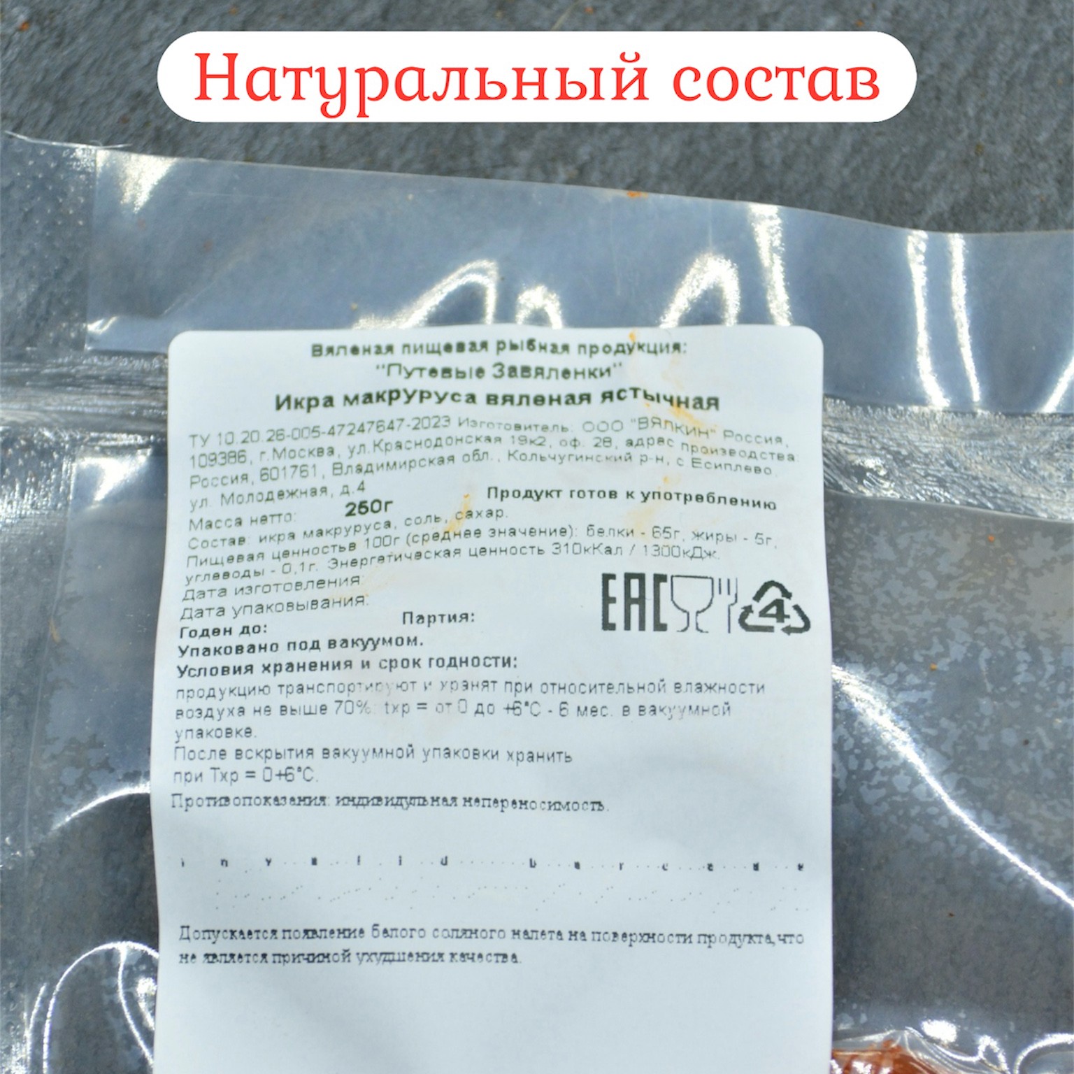 Честная рецептура: Изготовлено по ТУ без использования усилителей вкуса. Натуральный вяленый продукт в вакуумной упаковке для сохранения свежести.