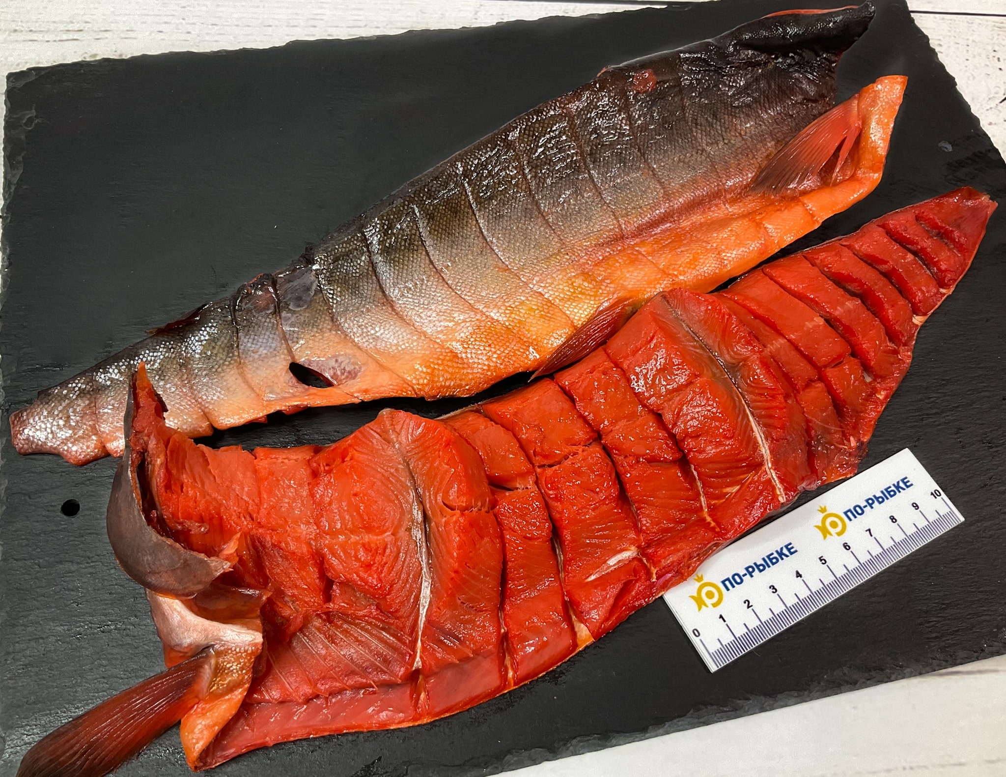 Горбуша холодного копчения. Вид разделки: пласт (юкола), филе на коже.