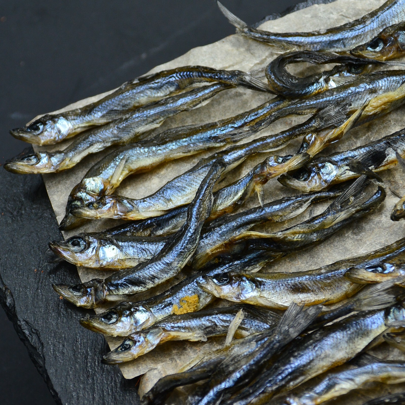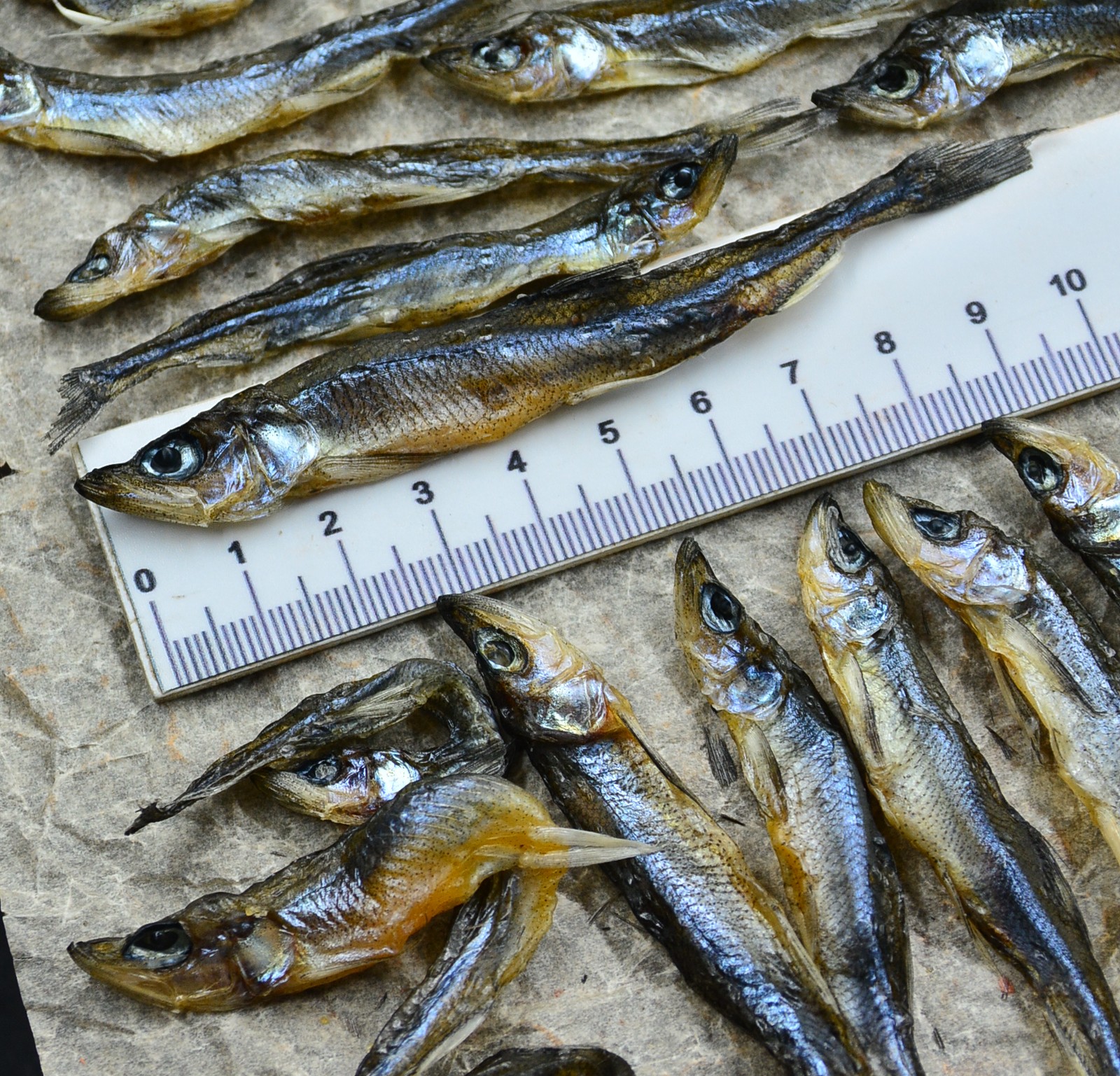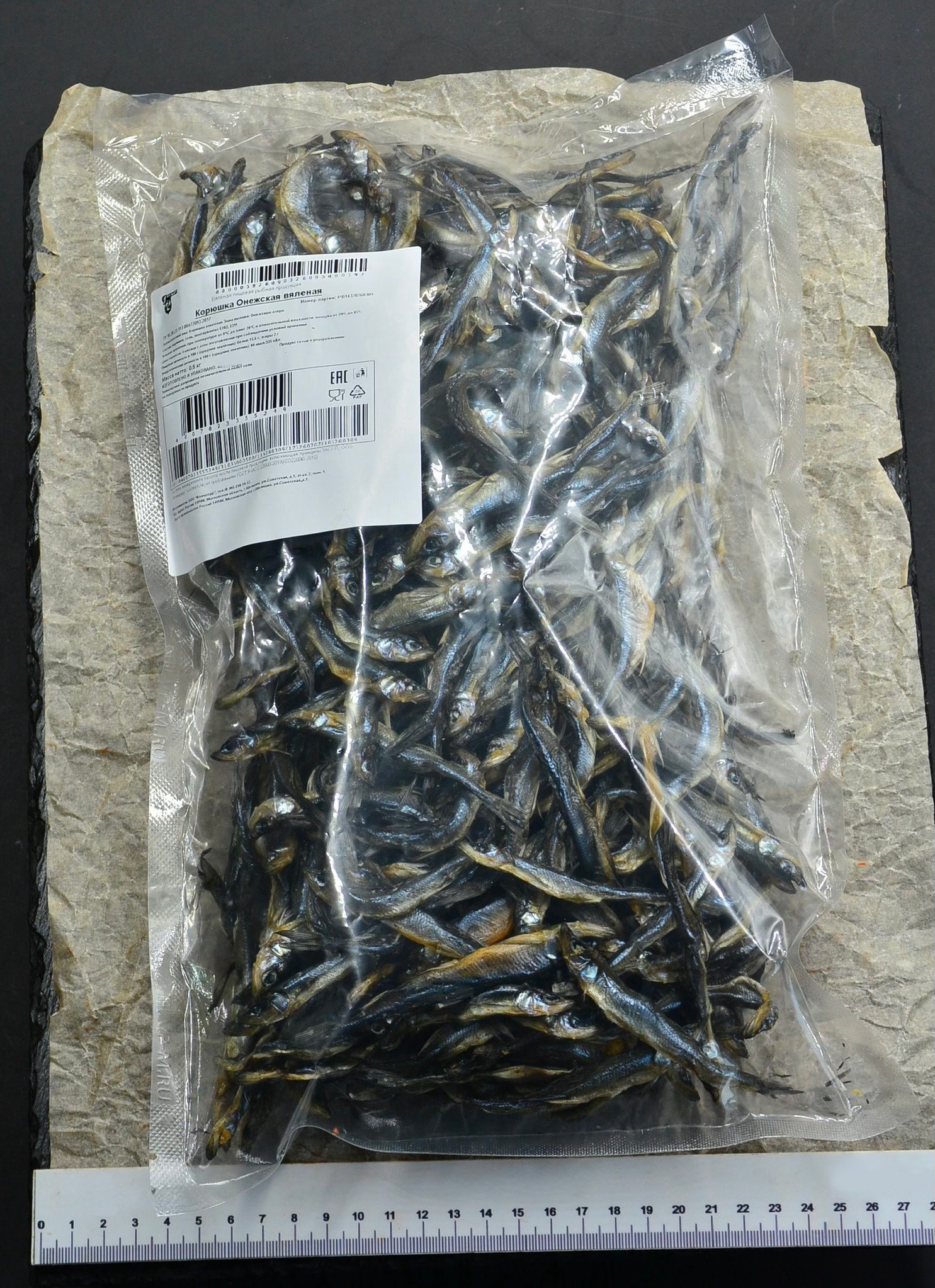 Длина рыбки — от 6 до 11 см, ширина тушки — от 1 до 2 см. Это мелкая, «семечковая» корюшка, которая особенно ценится за то, что её можно есть целиком, и она идеально провяливается до хрустящего состояния. Это натуральный продукт, фактические размеры могут отличаться от средних значений.