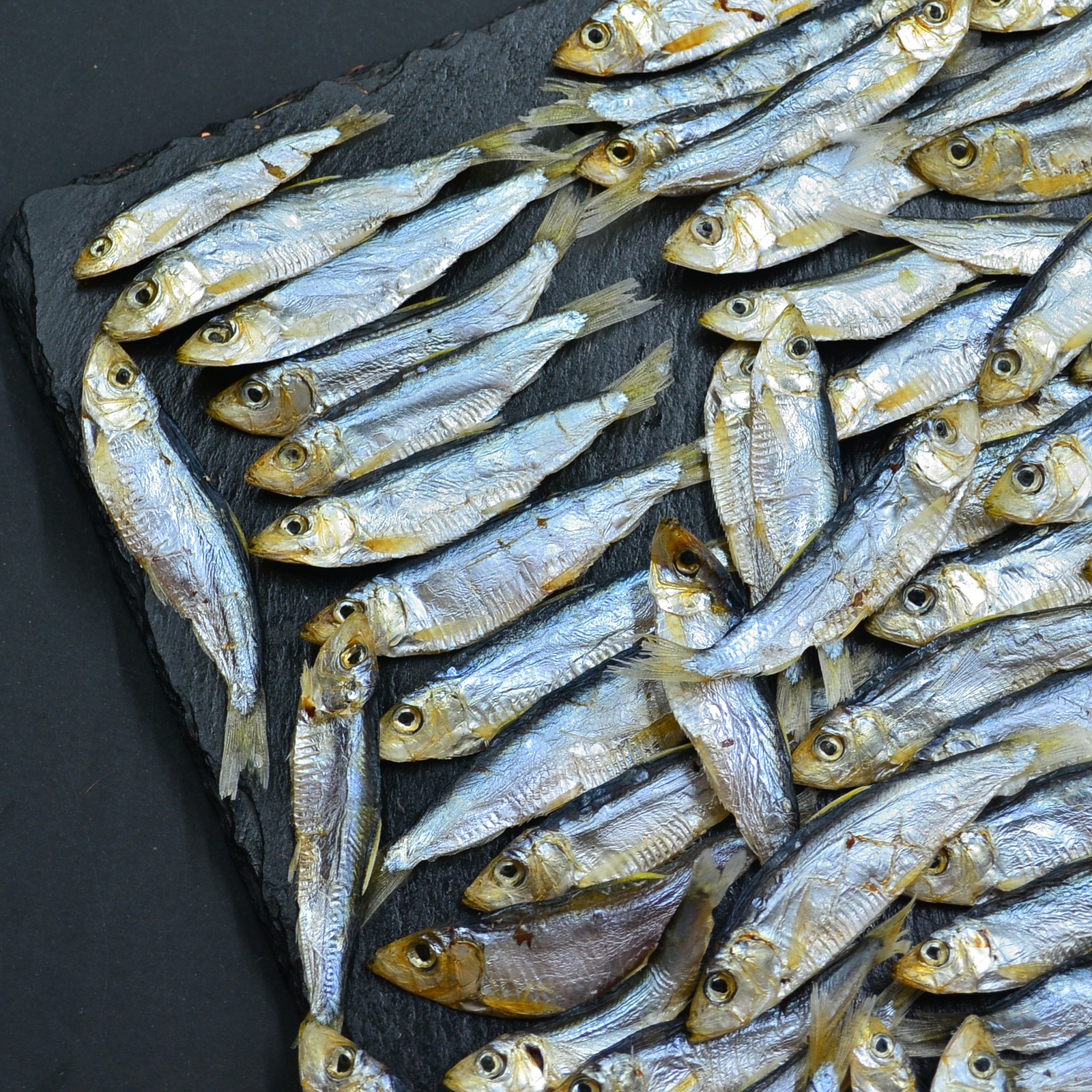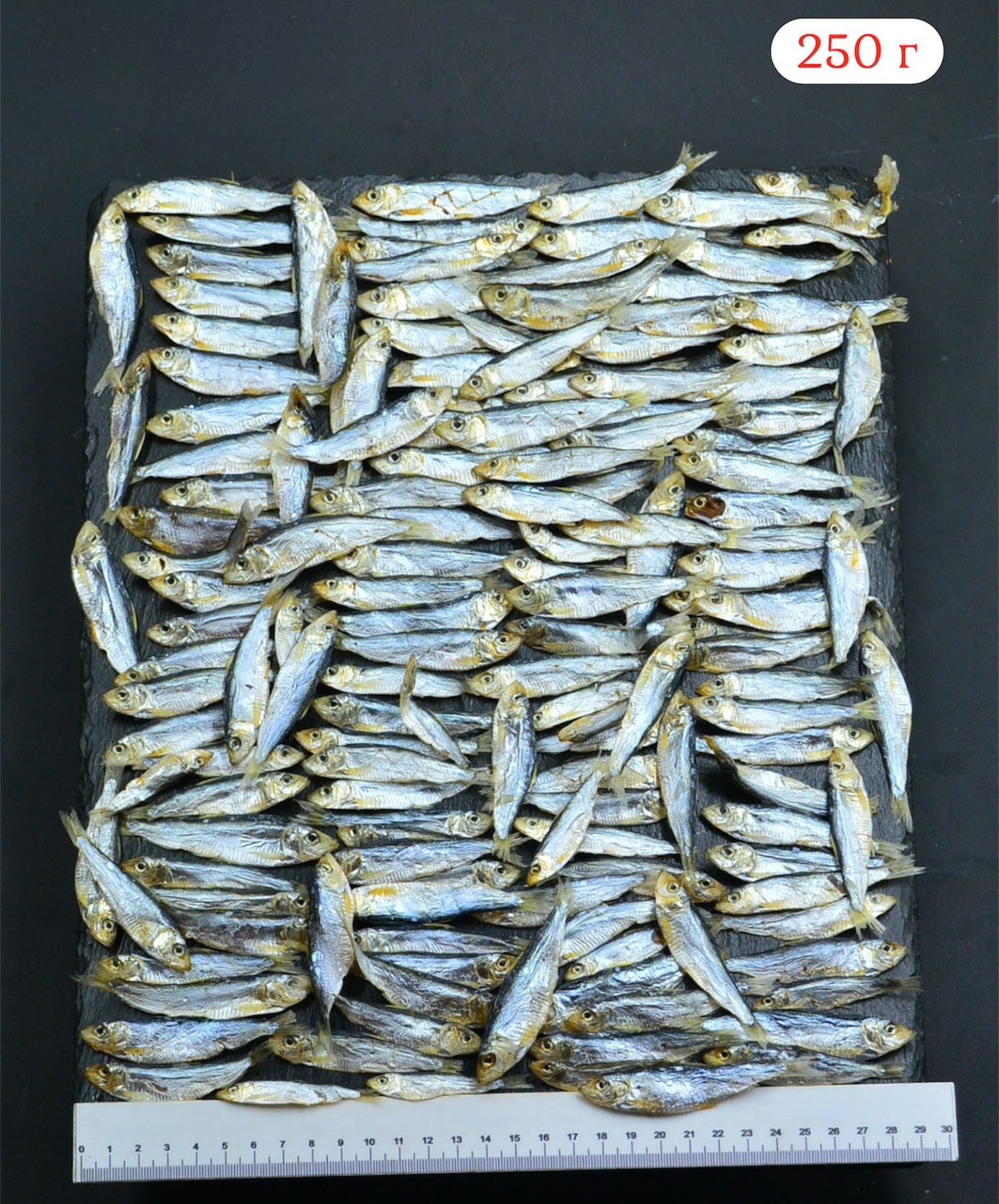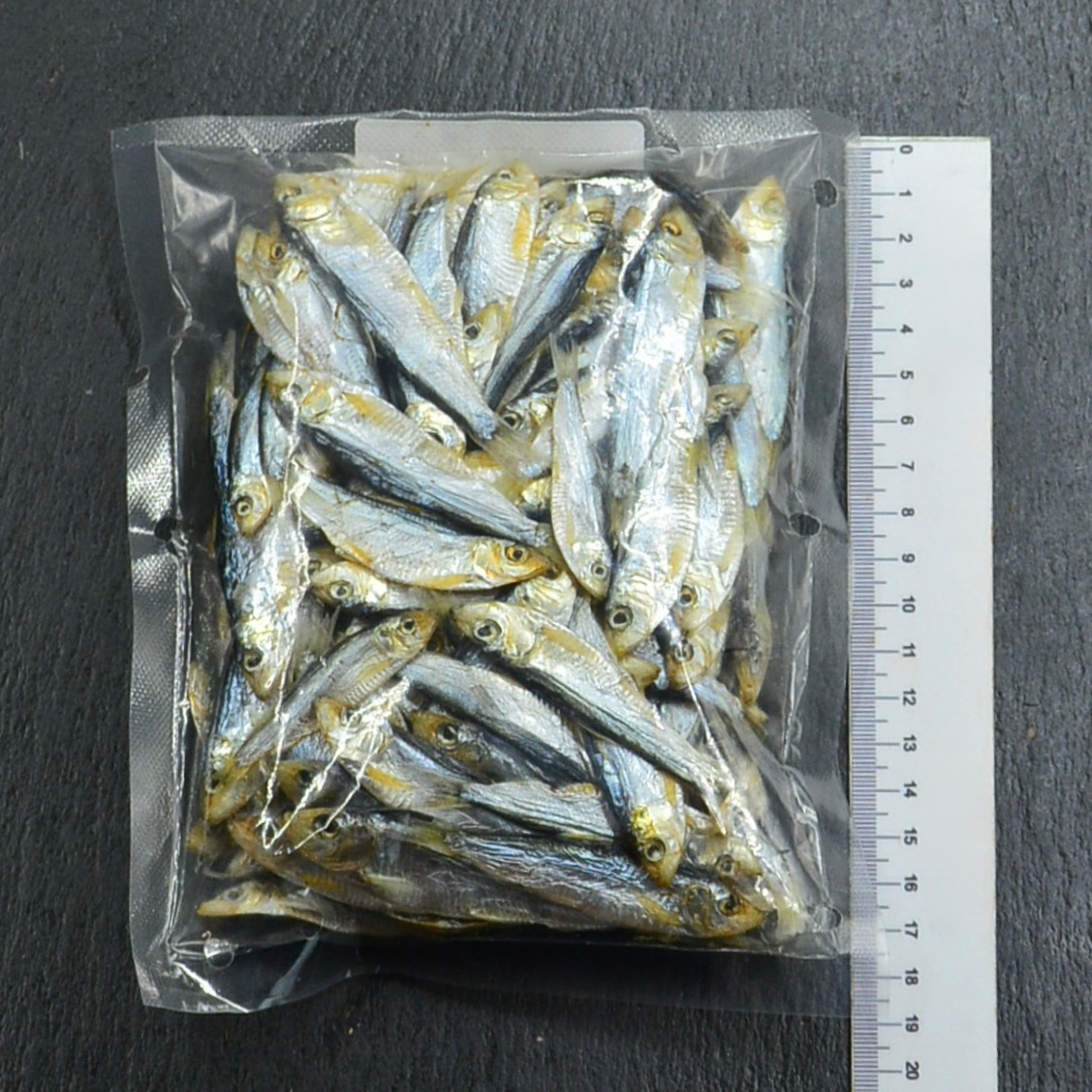 Длина рыбки от 5 до 11 см, ширина — около 1–2,5 см. Это натуральный продукт, фактические размеры могут отличаться от средних значений.