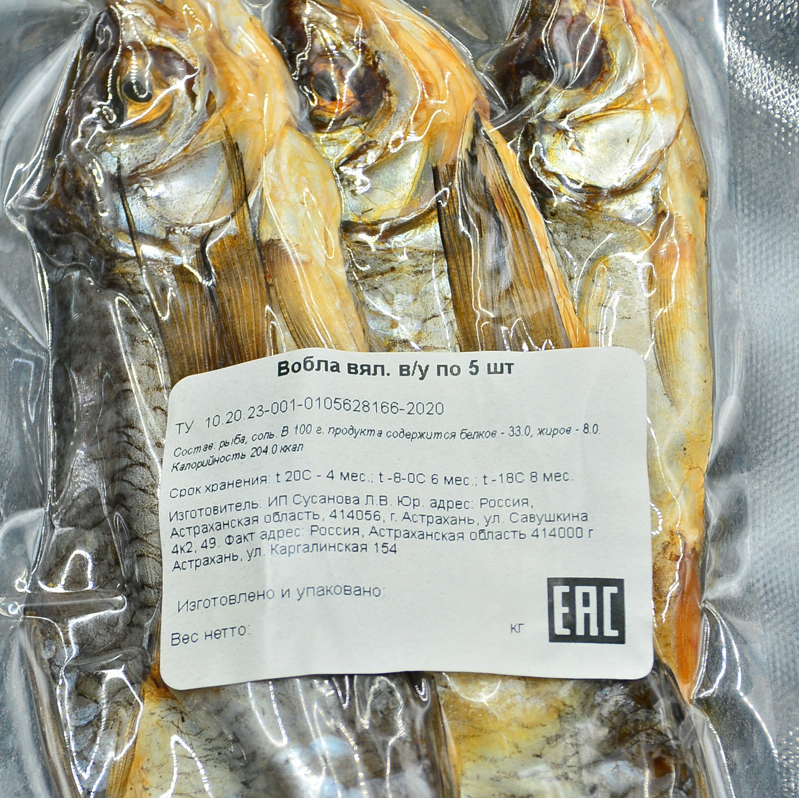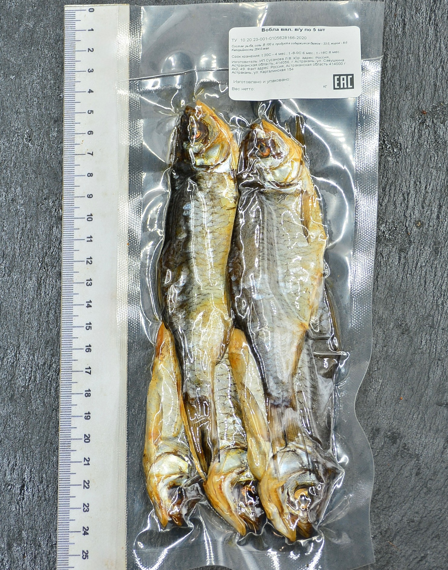 Знак качества: Изготовлено и упаковано непосредственно в Астрахани, что гарантирует использование свежайшего сырья и соблюдение вековых традиций вяления.